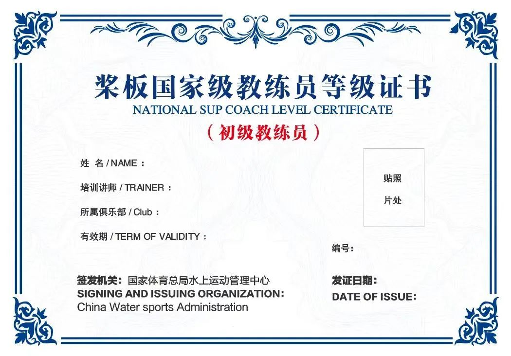经考核合格的学员将颁发全国桨板初级教练员证书,初级教练员可开展桨板运动水平等级培训工作,培训合格的学员将由国家体育总局水上运动管理中心颁发桨板运动水平等级证书。