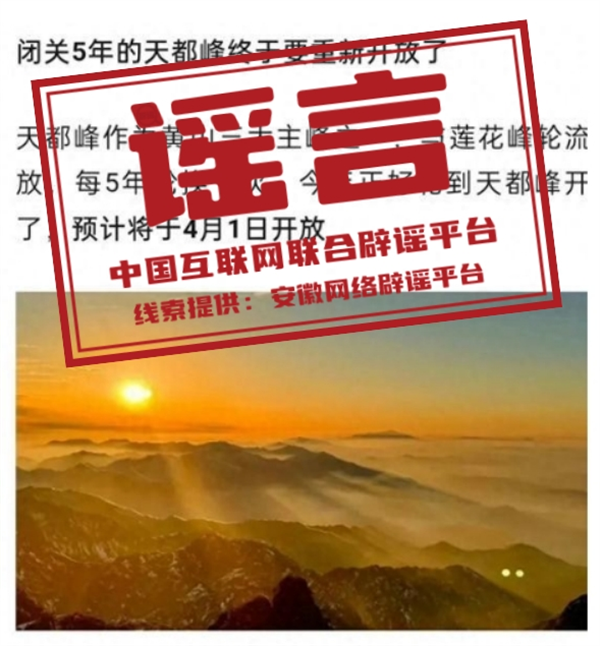 真相:近期,有网络平台账号发布信息称“黄山天都峰将于4月1日开放”。对此,黄山风景区管理委员会官方微信“中国黄山”发文表示,“景区尚未明确开放天都峰的具体时间,相关工作还在开展过程中”。据了解,黄山风景区管理部门对景区内高海拔景点实行定期封闭轮休,在封闭期间,游人禁止进入,以人工辅助自然恢复的方式,促进树木、林下植被生长,以期生态环境得以改善。天都峰目前仍在封闭状态,其对外开放须经多方评估,确保达到预期的轮休效果,并对区域内的基础设施予以维护提升,待自然环境、安全保障等符合开放条件后,再确定具体的开放时间。天都峰开放日期一旦确定,黄山风景区将会提前向社会公布,敬请游客朋友们关注官宣。(来源:安徽省互联网违法和不良信息举报中心、“中国黄山”微信公众号)