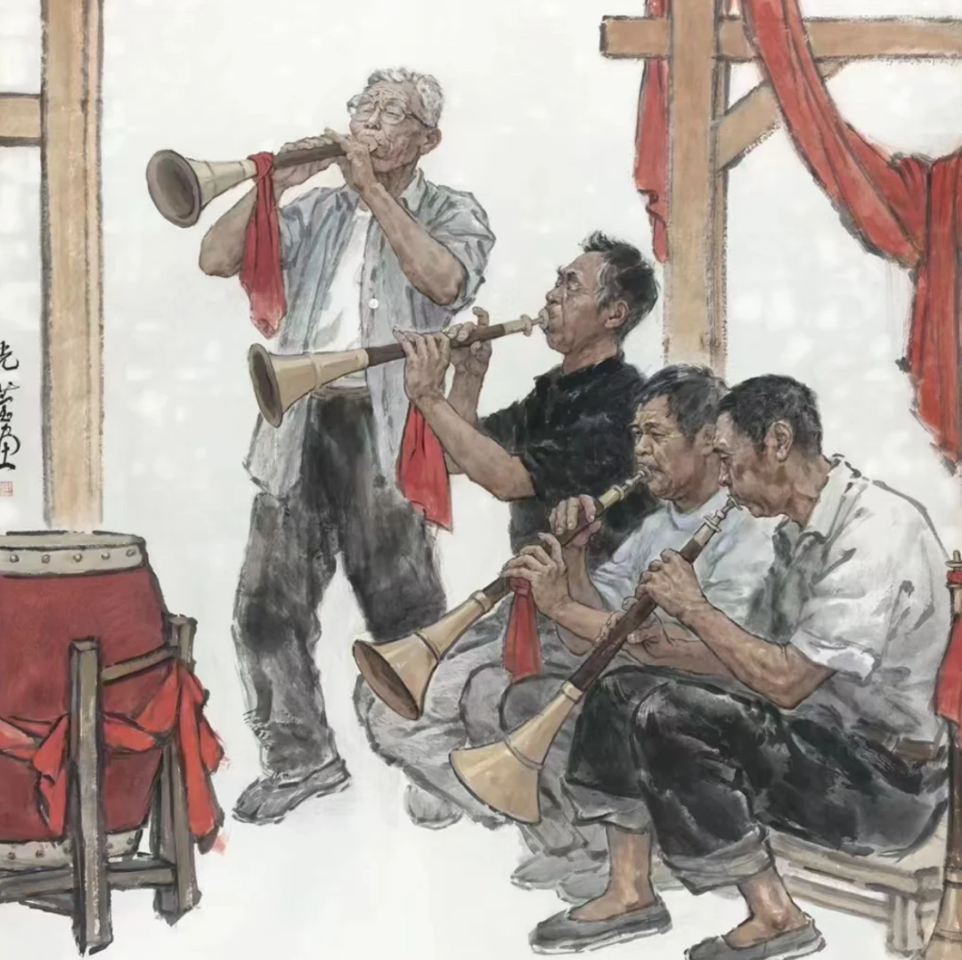 爷爷吹唢呐时,喜欢眯着眼,像睡着了一样,只有两边腮帮子鼓个包,一闪一闪,如田里的青蛙,枯枝般的手摸索着唢呐的吹管,声音便从那个喇叭筒里流出来。爷爷的唢呐声音高亢,曲调圆润,看似不讲求技巧,其实技法高妙,令许多唢呐班子心悦诚服,都敬呼他“响爷”。